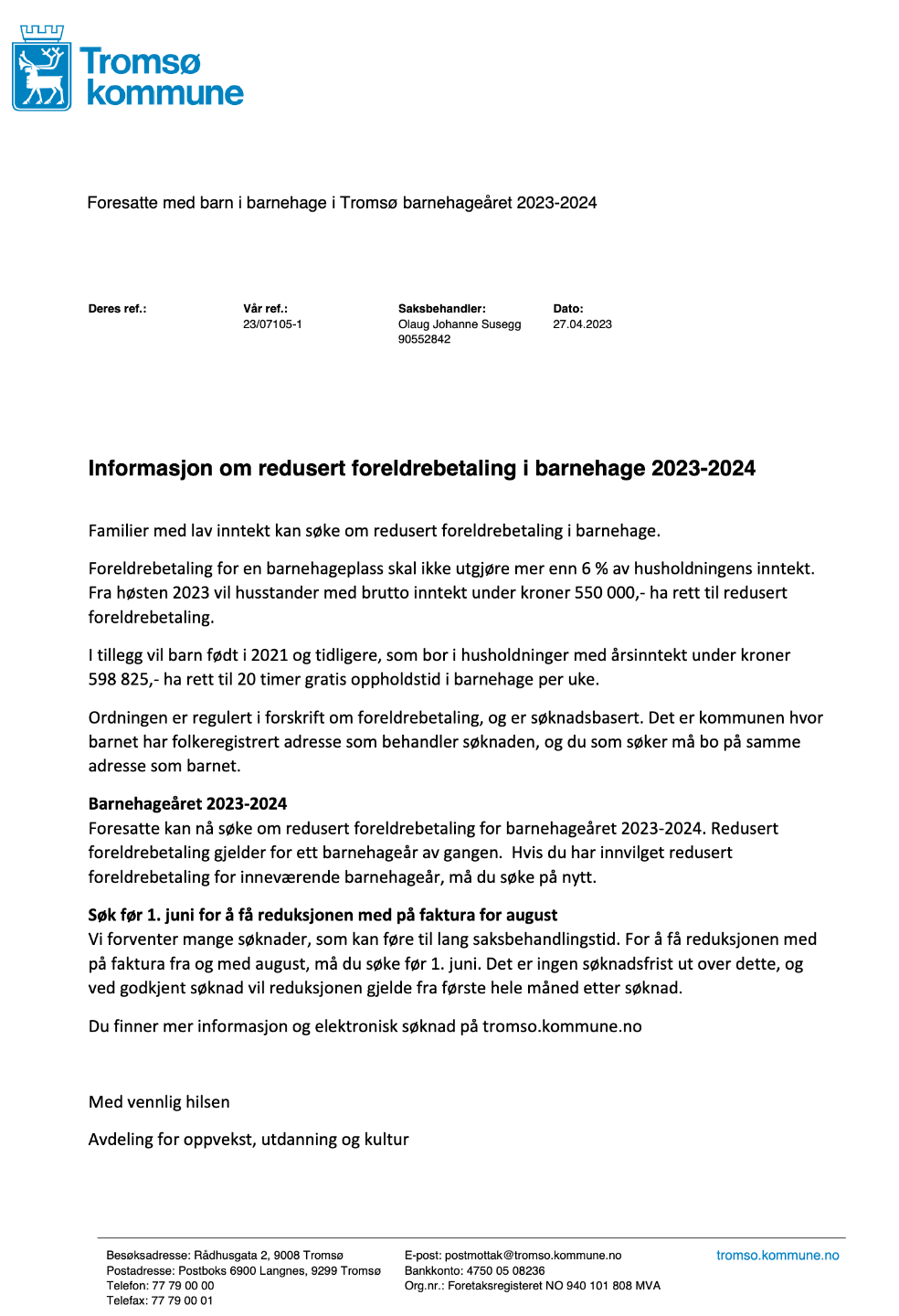 Det er mulig å søke om redusert foreldrebetaling i barnehagen. Klikk på bildet for å kunne lese teksten, eller gå til tromso.kommune.no