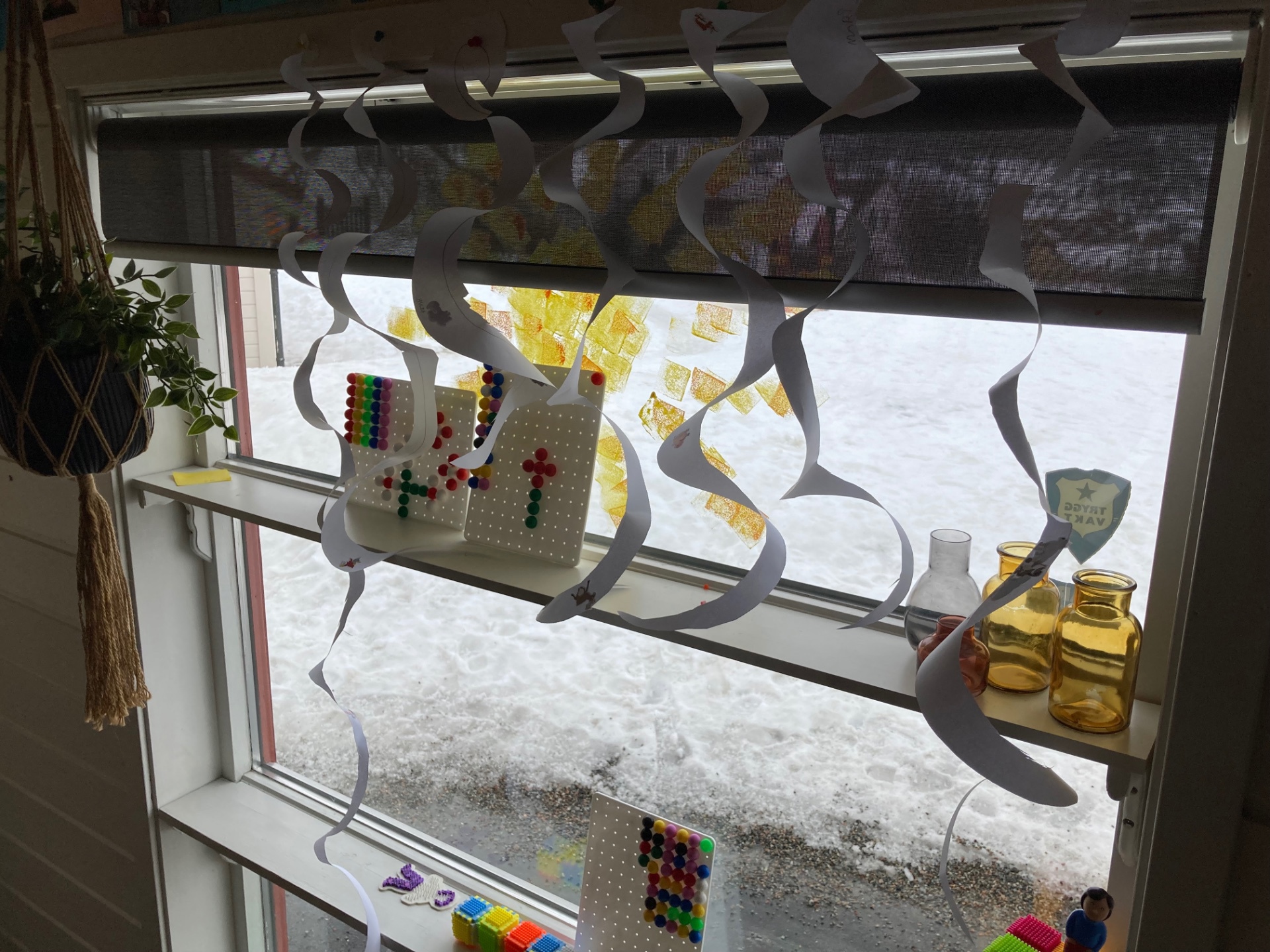 I april har vi fargen "hvit" som månedens tema. Barna på Naustet har laga hvite uroer, som henger i vinduet. I mai har vi et dyr som månedens tema, og det blir "sau/lam".