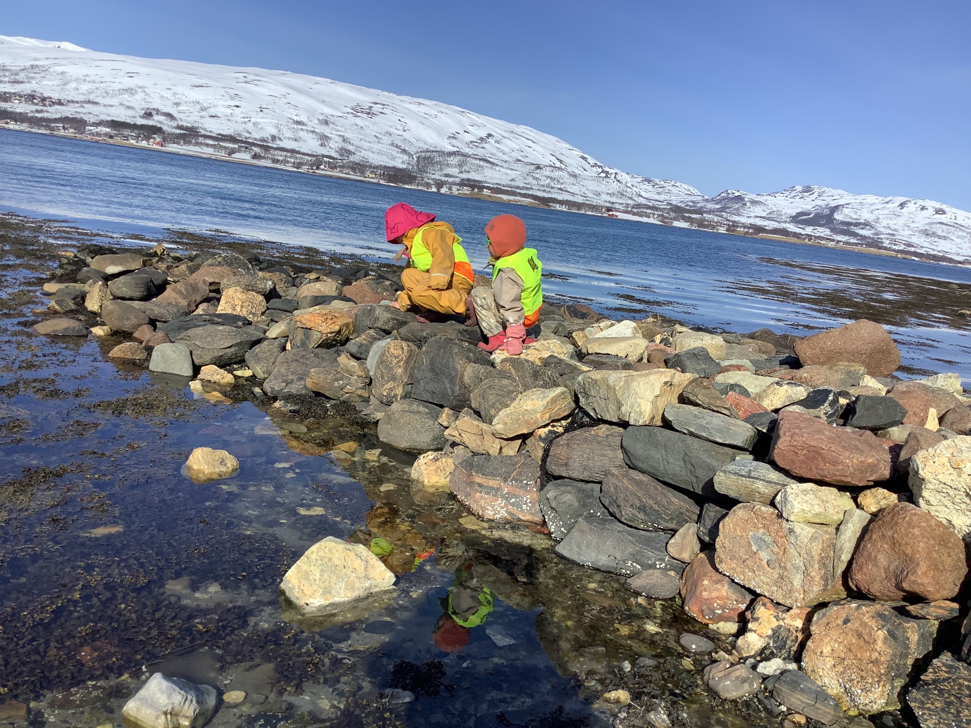 Naustet og noen fra Sjøstjerna gikk en fin liten tur til fjæra torsdag 18.04., det var så fantastisk vær! Barna kosa seg med balansering på steina, hilse på endene og finne stein å kaste i havet.