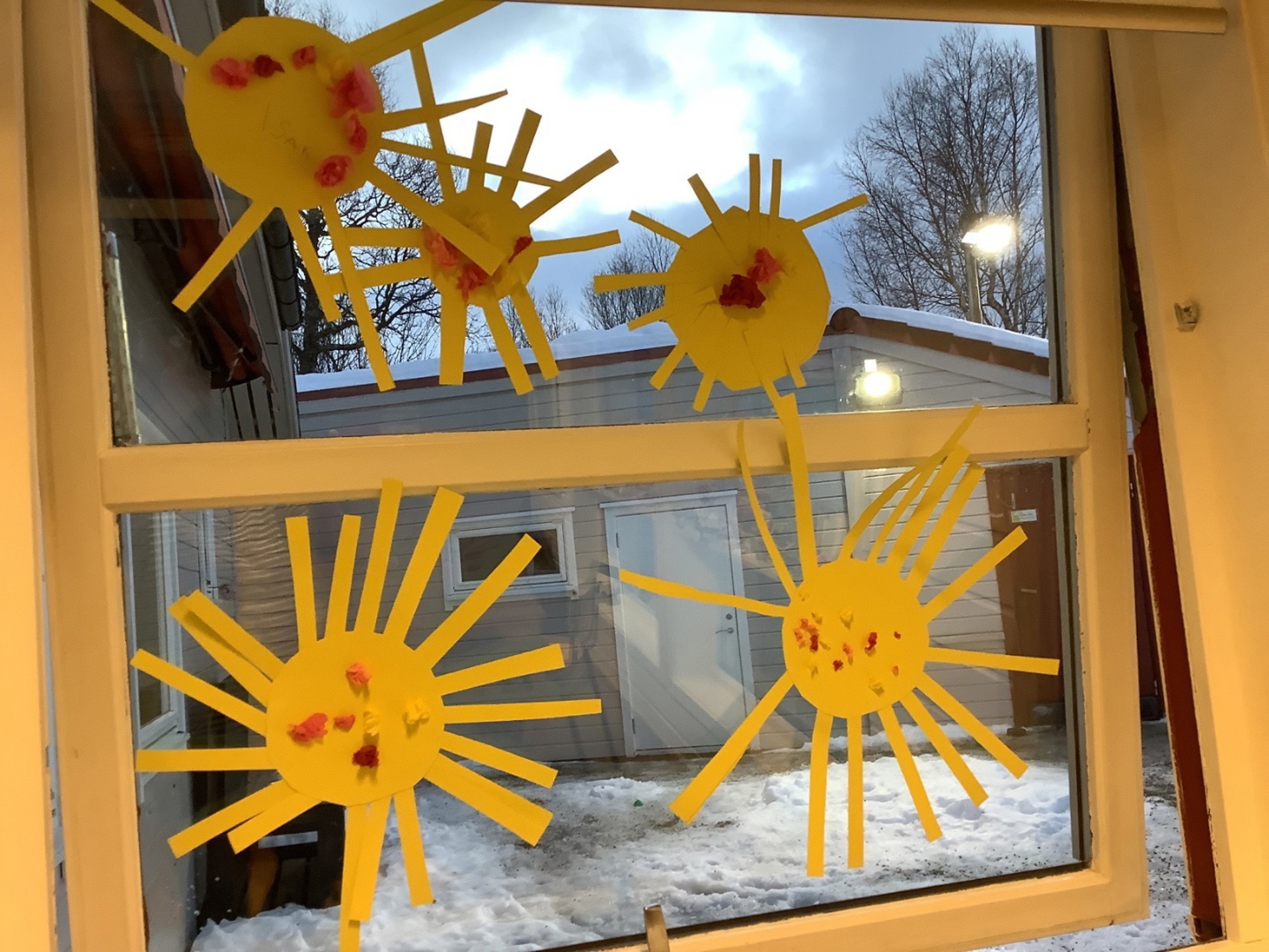 Denne uka kommer sola tilbake. Vi har pynta avdelingene (bildet er fra Naustet), og tirsdag 21.1. er det solfest :)