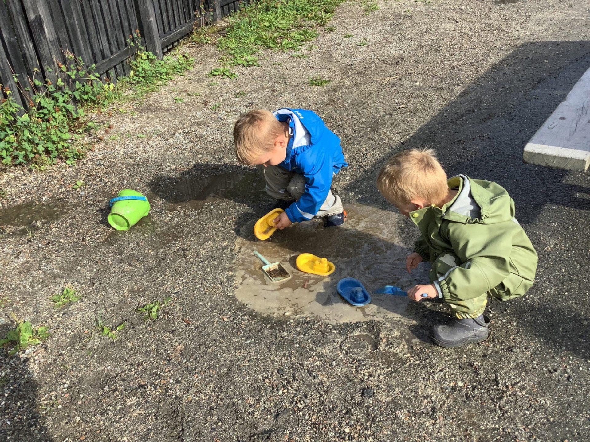 For et herlig liv - plaskeplask i vanndammen, hellehell inn og ut av koppen, fylle bøtta, tømme bøtta... gode regnklær gjør det mulig!